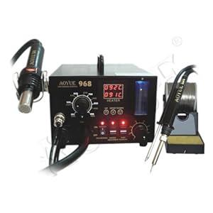 Este es un NUEVO Tres en Uno combina la la estación de reparación de una pistola de aire caliente de reflujo de aire, con un soldador y un amortiguador de humo. Esta alta calidad de una unidad muy de Aoyue, que es un productor líder en Europa y Asia, y ahora trae sus productos al mercado de los EE.UU.. Sólo un tornillo de la boquilla en el aparato de aire caliente, coloque la boquilla en el QFP, SOP, PLCC y SOJ a desoldar, aplique aire caliente para derretir la soldadura sin tocar el componente o la placa de circuito impreso, y levante suavemente el componente de la placa mediante la recolección de vacío. Soldadura de los SMD de reemplazo es igual de fácil. Mantiene una temperatura constante. Todos indicador digital de temperatura y presión, con control táctil en el panel frontal. El soldador tiene un control analogo, con ajuste de temperatura. Construido en el medidor de flujo de aire incorporado en el extractor de humo, que absorbe los gases a la derecha en la fuente, eliminando la necesidad de consumir espacio de los extractores de aire. Compatible con muchos tipos de boquillas de todos los fabricantes. Hay un auto cool-off proceso que deja el mando de encendido hasta que la boquilla esté fría, esto prolonga la vida útil del elemento de calefacción y para garantizar la seguridad, seguro diseño de la EDS. estación principal con pistola de aire caliente, aire boquillas (1124,1130,1197, 1313 ), G001 popper IC, Z003 aire caliente titular de la pistola, soldadura de hierro con punta, soldadura de hierro propia con soldadura de alambre de soporte, filtro de almohadillas, cable de alimentación